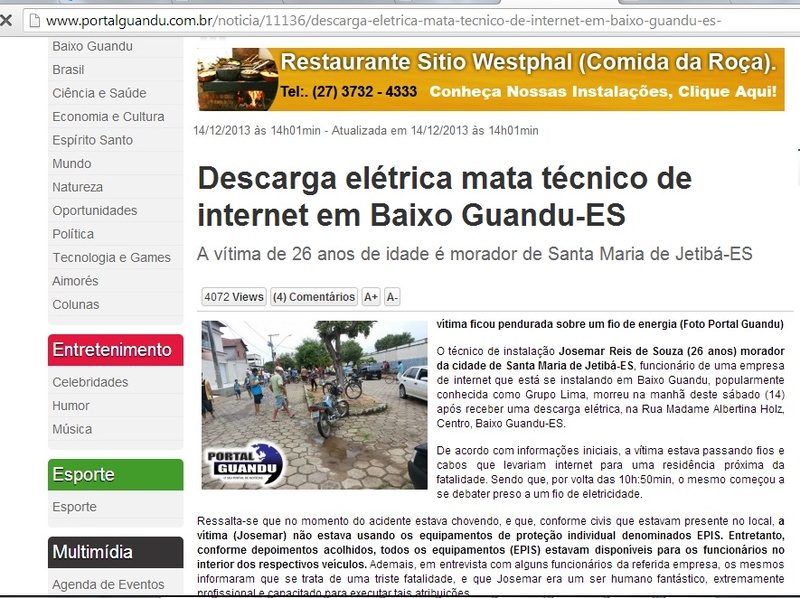 ELETROCUTADO ao subir em um poste para fazer a ativação de um cliente. Estava chovendo, e ao tocar na abraçadeira de fixação do transformador do poste ele tomou uma descarga de 11500 volts e morreu instantaneamente, ficando pendurado pelo cinto de segurança.