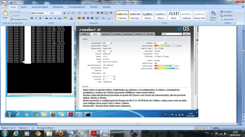 Rockets cravados em 21dbm e MCS 11 e o enlace passou 20Mbits/sm (real) pra cada lado. como o provedor precisava de somente 10Mbits, ficou excelente para o cliente e frente a todos os problemas de visada.
