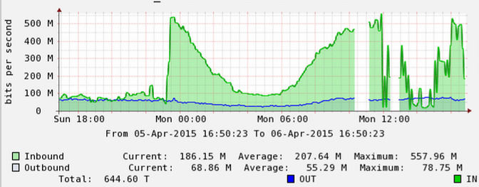 Olá pessoal. Estou com um problema no cacti que é o seguinte: Numa determinada interface que eu monitoro nele ela passa mais de 700M de trafego, porem o cacti só contabiliza até 550M. Além de 550M ele não traz a amostragem e enquanto o link trafega além de 550M fica baixa a amostragem. Poderiam me ajudar?