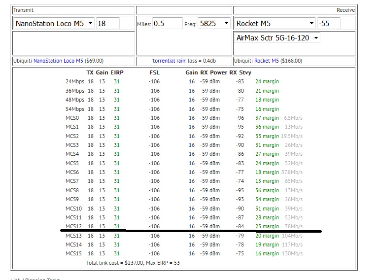 Se usar o Loco5 velho, vai ter que usar modo A (De 1999), e com esse sinal vai poder usar data rate de 36Mbps, que em PTMP mal permite vender mais que uns 12 ou 13Mbps agregado. Usando polarização dupla, em MCS12 com 20MHz (Logo, usando modo N) dá pra entregar 25Mbps agregado tranquilo (Desde que todos os clientes tenham zona de Fresnel totalmente limpa. Cliente sem visada não pode ser atendido nem que seja da família, ele degrada demais a qualidade da rede em geral, pra ter rede boa tem que NEGAR clientes sem visada perfeita, se sair atendendo todo mundo não tem nenhum hardware de R$ 3 mil que faça milagre).