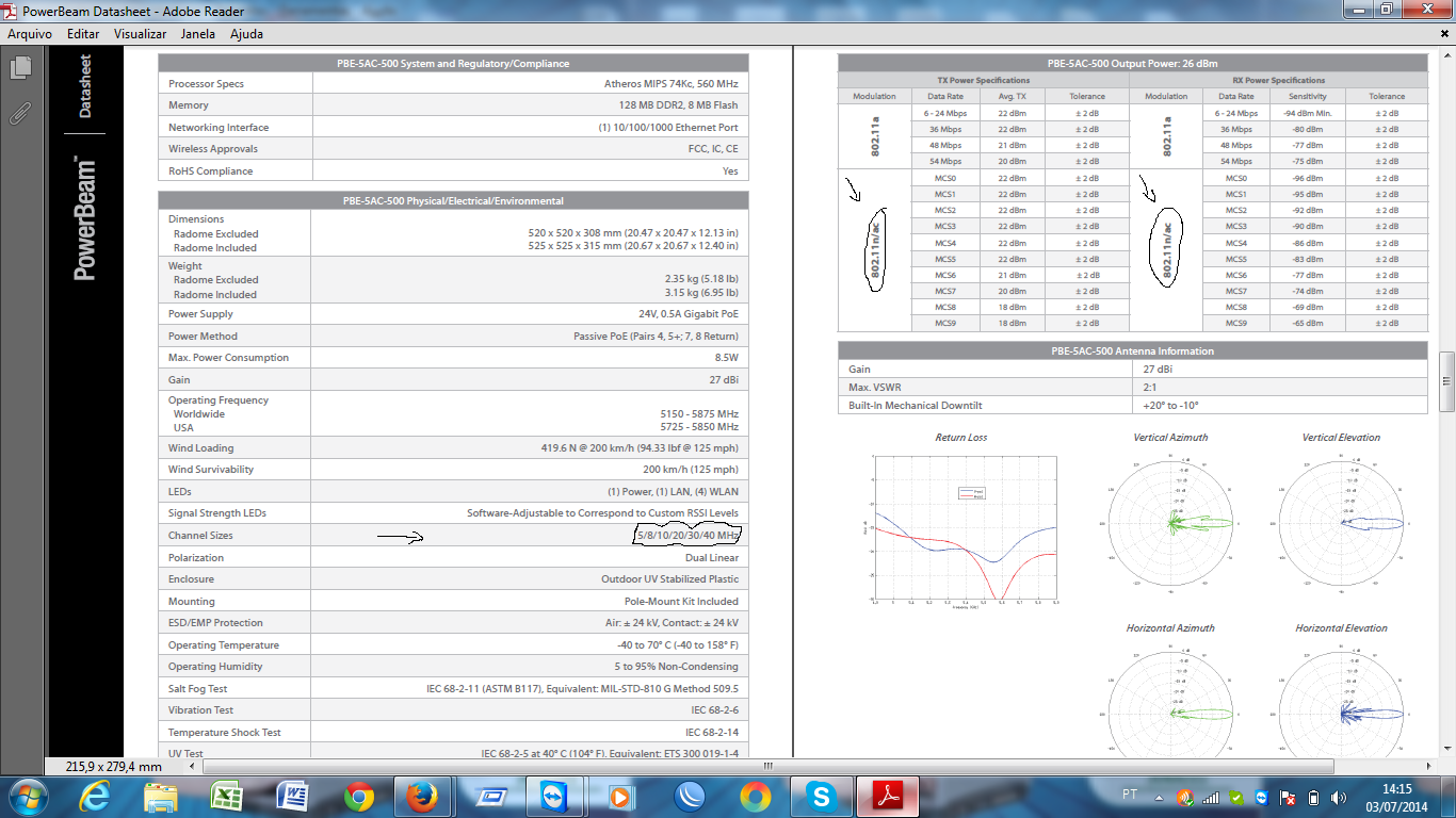 Como eu previa saiu o datasheet da PowerBeam 5Ghz AC, 500mm que provavelmente vai ser a mesma coisa para a Rocket ac nada de 80 mhz de largura de canal menos mal isso mostra a responsabilidade que a UBNT tem na frabricaçao de seus equipamentos ,largura de canal de 5 a 40mhz execelente agora ja da pra começar a sonhar um pouco mais alto ....