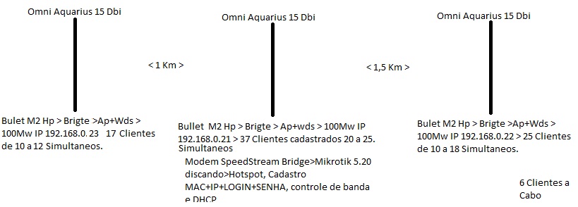 Pessoal montei esse esquema aqui, e estava tudo funcionando perfeito, ping entre 35~55 entre as estações, navegação tranquila em todos os clientes, acesso a todos os bullets e clientes da rede normal, Na sexta instalei outro cliente com Radio Ap Router firware 9.3 plus, 100Mw sinal 74% -42Dbm, porém de sexta pra ca a rede esta muito lenta..coloquei meu not direto no cabo pra testar, ping de 600~2400 e muita perda de pacotes...derrubei o cliente do aproute e tudo voltou ao normal..fui ate o cliente resetei o ap..reconfigurei, conectei e a rede ficou lenta novamente, conclui q era o ap..troquei por um oiw 2421apg, e continua lenta.