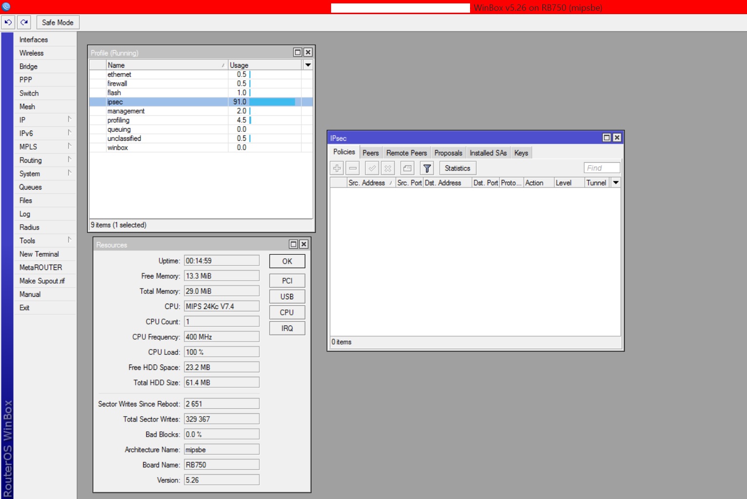 Já venho a dias pesquisando e perguntado a amigos sobre o problema do Ipsec, ele consome 90% e não tem nada configurado nele, acontece com RB ou em pc x86.