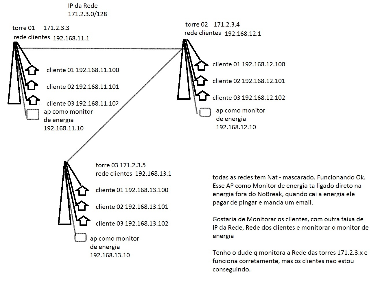 Boa tarde, a todos esse Forum eh demais. Estou com uma duvida e não consigo resolver, ja tentei de tudo, mas nada. Alguem poderia ajudar como faço conforme imagem abaixo. Tenho minha Rede das Torres que estao em uma Faixa de IP (171.2.3.x) e os clientes estao em outra faixa de IP, cada uma diferente das outras torres. Gostaria de monitorar esse clientes, e os monitores de energia que estao ligados por cabo na mesma faixa de IP do Clientes, eh possivel isso? Alguem poderia me ajudar. Estou querendo fazer isso faz tempo e nada, ja procurei na Net e não achei muita coisa objetiva. Obrigado