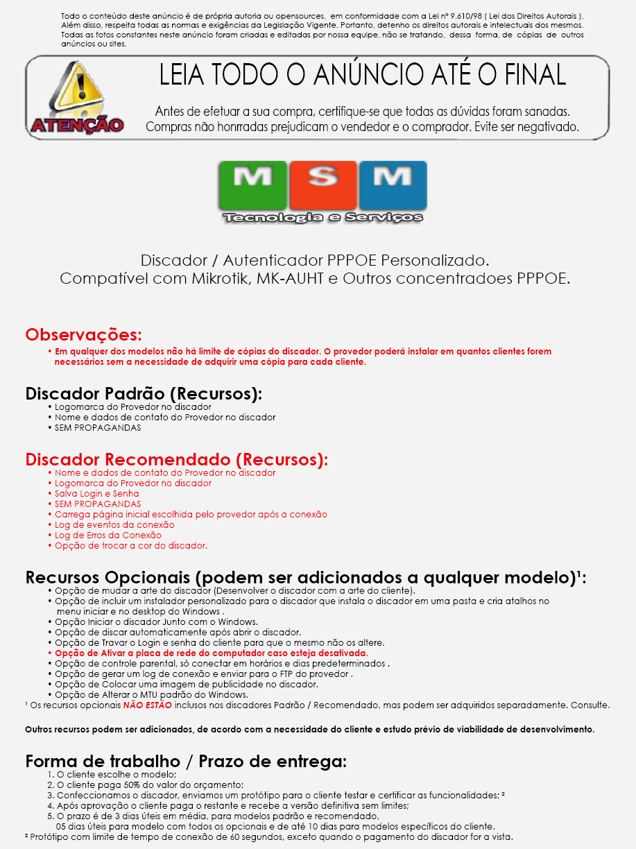 Código HTML:<p><span style="font-size: xx-large; color: #ff0000;"><span style="font-family: tahoma,arial,helvetica,sans-serif;">Observações</span>:</span></p> <ul> <li><span style="font-size: medium; color: #ff0000;">O valor anunciado é referente ao discador PADRÃO, verifique abaixo os recursos disponíveis para ele.</span></li> <li><span style="font-size: medium; color: #ff0000;">Consute-nos sobre outros valores e recursos.<br /></span></li> </ul> <p></p> <p><img style="float: left;" src="https://oxqqzq.dm2301.livefilestore.com/y2psWObxoLXL37Ym8RF6EfPsBgkEZPXskYaUmCKTw0rH3HdoDHB5DEGY_O7TvtBGfSC_rrKFHVhd6_h46NAHKyDjn_4dX2_UFiQv0ECxkowbm0/Anuncio.png?psid=1" height="1932" width="917" /></p>