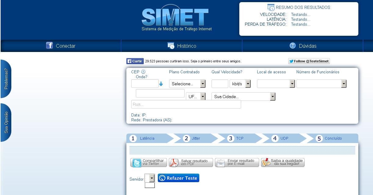 Esse problema eu tenho de forma variável, dia-sim-dia-não, sem alteração na conexão local, só o que muda são as rotas bem distantes daqui, mas isso não ocorre com outros testadores de velocidade (Que eu tenha testado), só no SIMET.