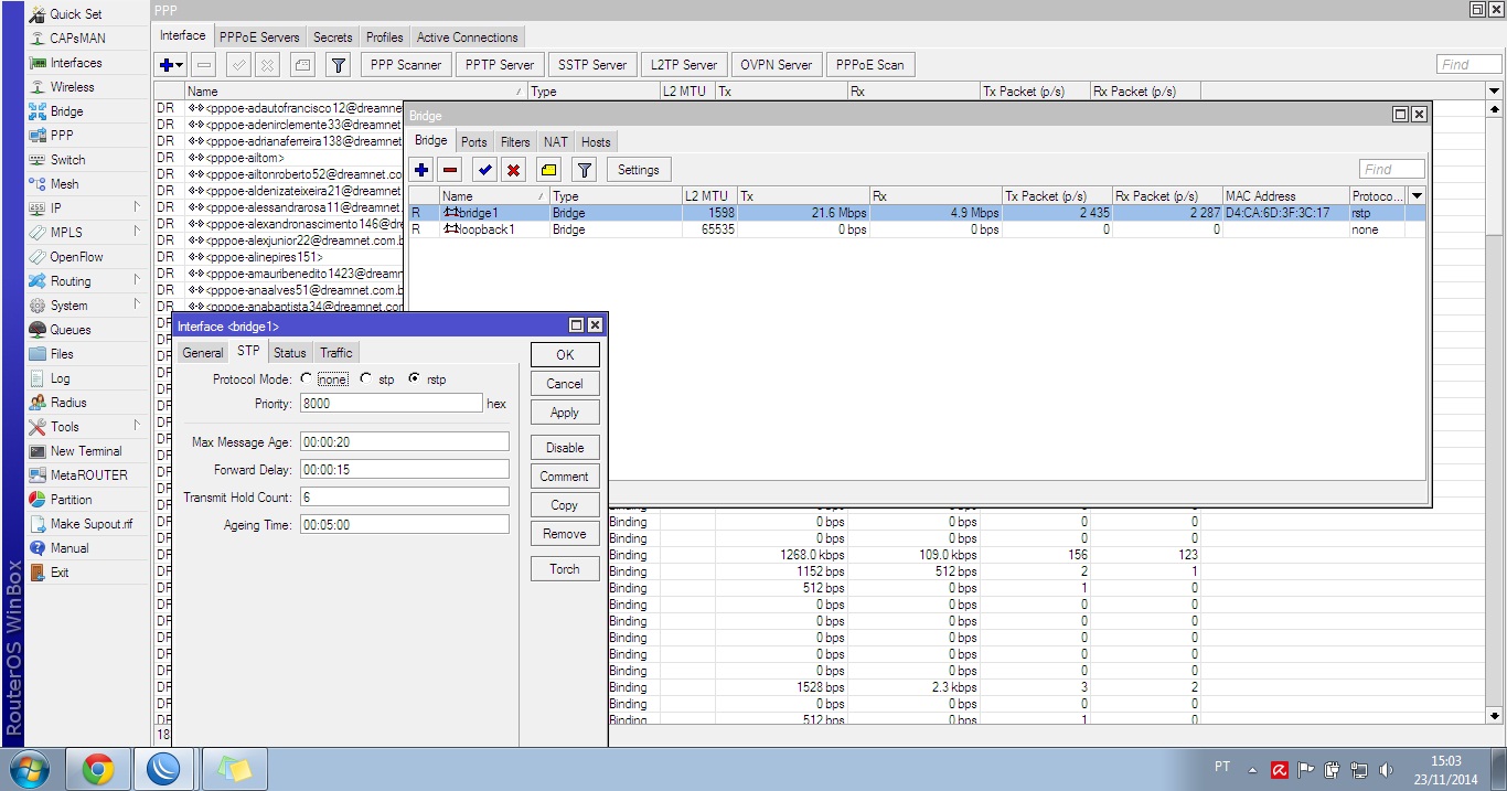 Alguns usuários ficam caindo na rede, desconecta e conecta novamente, e acabam prejudicando todos os outros clientes. Quando isso acontece estes clientes não pegam Ip do Servidor PPoe, quando vou na interface ao invés de estarem com as Siglas DR, ficam apenas com a sigla D. No inicio pensávamos que poderia ser algum Loop na rede, mas fomos desabilitando Pop Por Pop e nada, casa hora o erro aparecia em um cliente diferente e em um diferente endereço, ja mandamos técnicos em todas as torres para analisar algum erro no Pop, más até agora nada. Ficou 1 dia sem dar este erro, hoje pela manha aconteceu novamente.