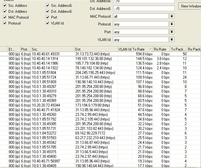 Organiza o Torch por Tx/Rx Rate pra podemos ver no Torch qual maior trafego...