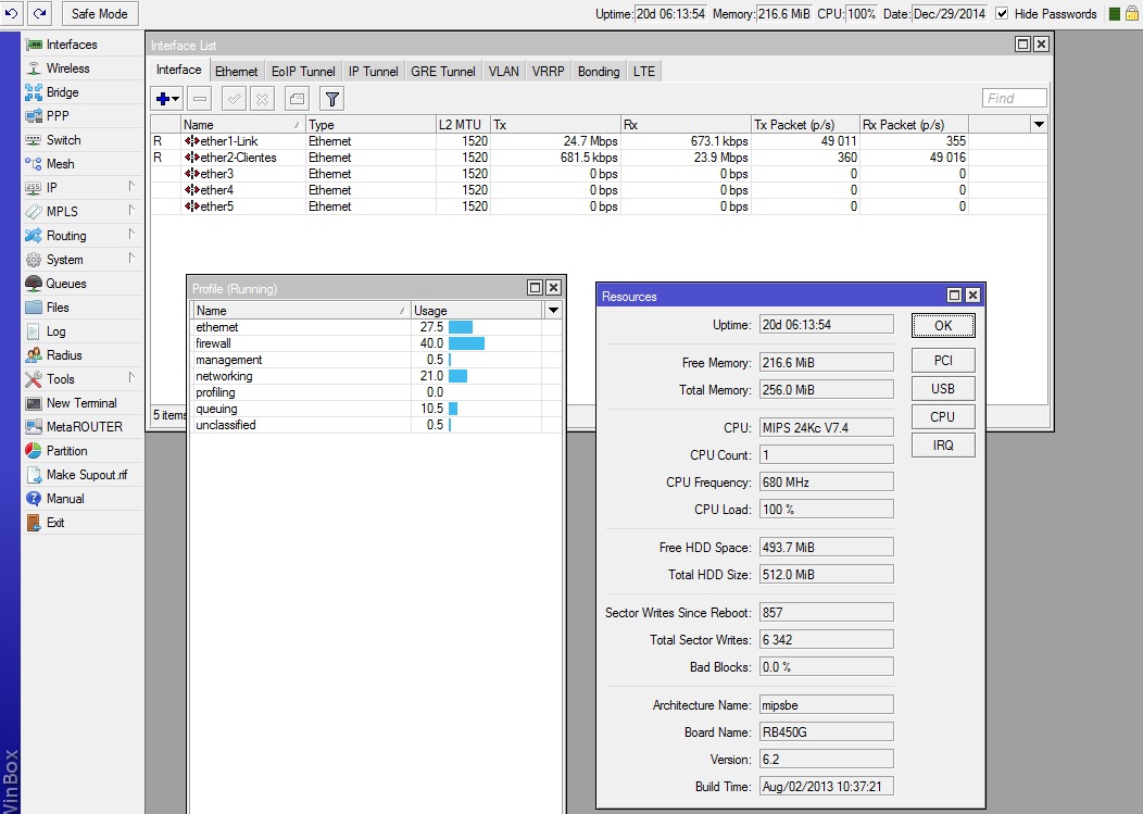 Tenho uma rb750 e uma rb1100, não trabalho com enlaces, utilizo para rede interna com roteamentos, vpn e entrada de links da internet, um determinado dia vi que o consumo de CPU também estava muito alto, percebi o que estava gerando este consumo era o TheDude que configurei para gerenciar os links, não sei se configurei errado rssss mas depois que desliguei o equipamento com o DUDE voltou ao normal.