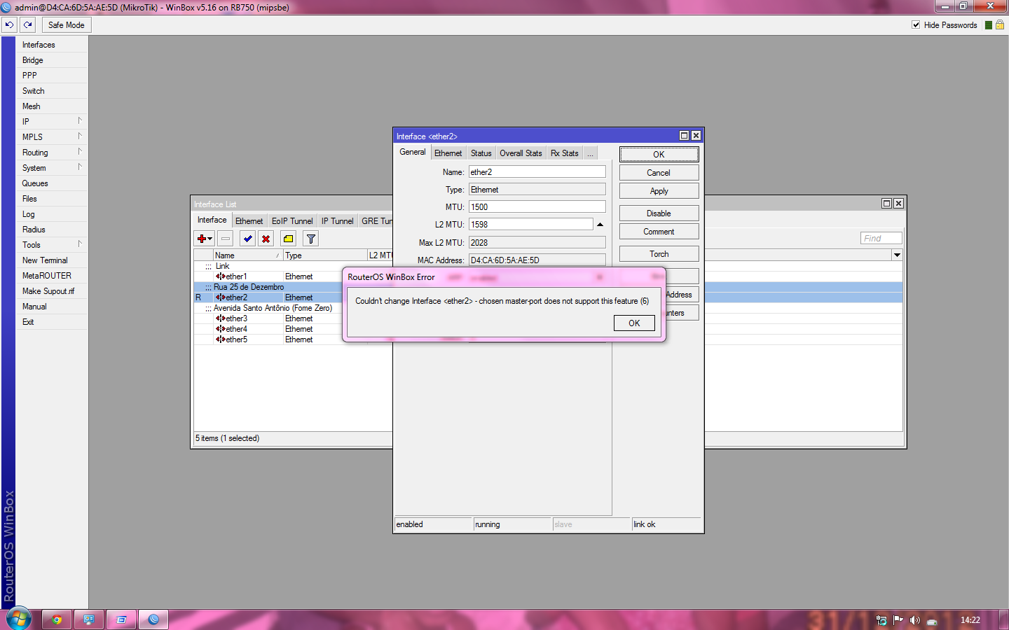 ''couldnt change interface <ether2> - chosen master-port does not support this feature (6)''