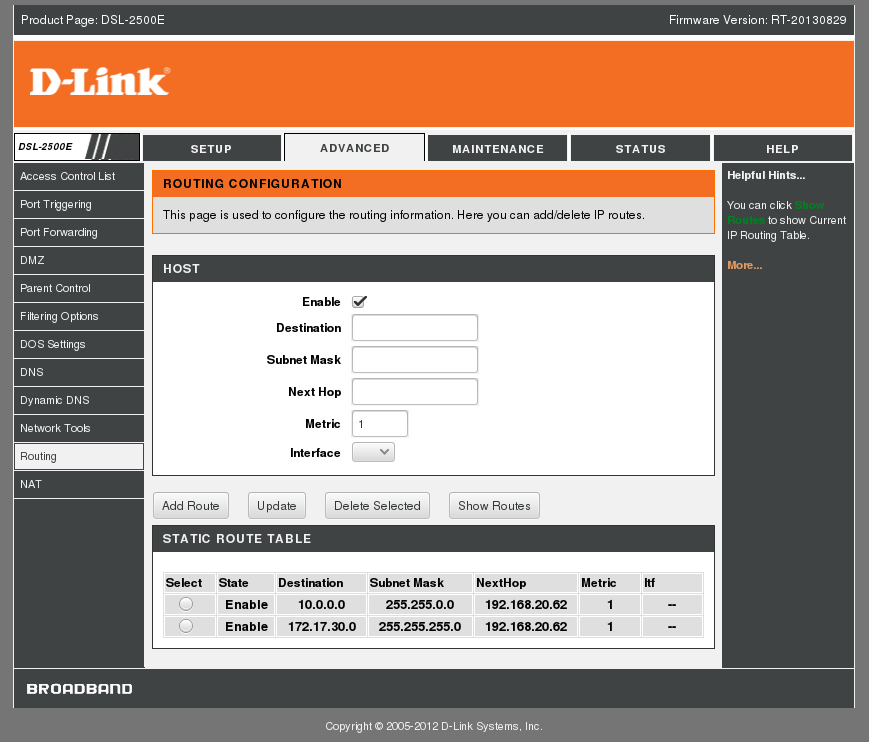 Segue um exemplo de como fiz as rotas num modem D-LINK DSL-2500E.