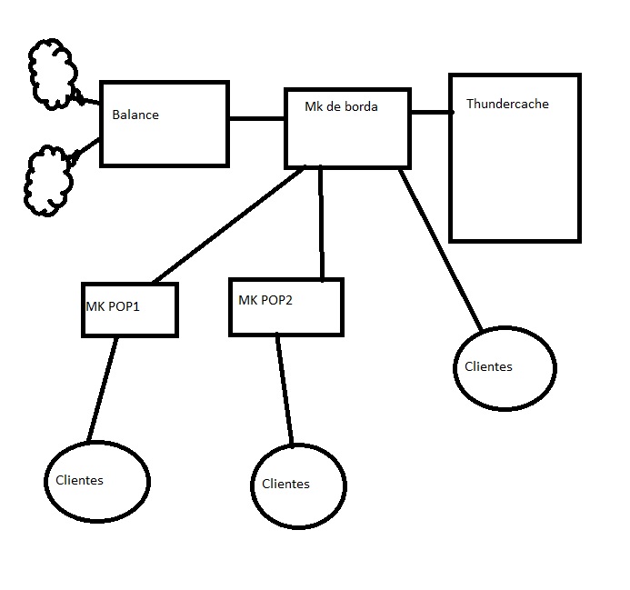 Cara o ideal é vc ter uma RB com balance, no local do Switch, outra Rb concentradora ( essa com o Thunder ) e ai dela saindo para as outras rbs. veja um exemplo: