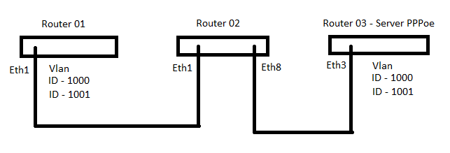 Bom dia pessoal, gostaria de perguntar para alguém mais entendido em vlan se existe a possibilidade de fechar a vlan 1000 e 1001 do router1 para o router3 sem colocar a Eth1 e Eth8 do router2 em uma bridge. Lembrando que os três routers são Mikrotik. Obrigado.