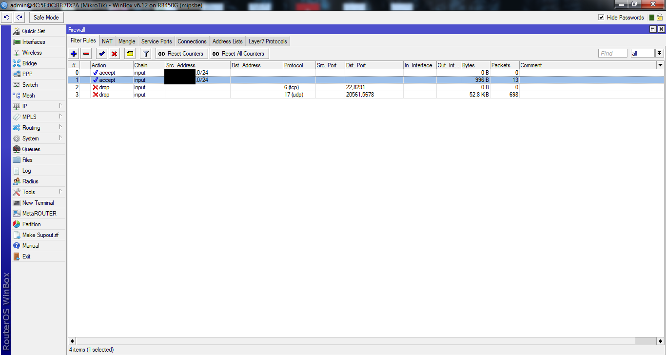 Estou tentando fazer uma regra simples para bloquear o acesso ao mikrotik. Criei duas regras de input com ação accept para as redes que tem autorização de acesso, depois duas regras de drop para o restante. Estou acessando o mk de uma interface que não está na regra de accept, assim a regra de drop está contando os pacotes, porém continuo acessando normalmente.