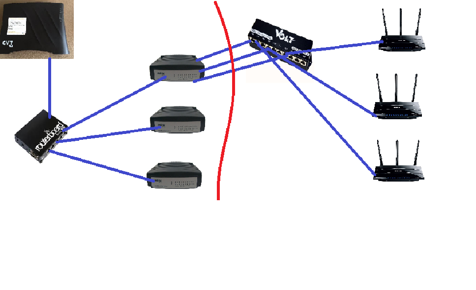 Olá pessoal, estou com uma pequena duvida pois andei pesquisando sobre como configurar a RB450g, aprendi muita coisa ja, mas ainda continuo com uma duvida sobre a configuração que terei que fazer para distribuir o link que recebo de 35 Mb para o switch Intelbras Sg800 8 portas 10/100/1000 mbps. Penso em usar um cabo CAT 5e ou um Cat 6 para fazer a ligação de meu modem GVT para a RB, e da RB ao switch's, e usar um cat5 ou cat 4 para ligar o switch a roteadores Poe( e fazer a alimentação deles a partir de uma patch panel da volt de 5 portas como mostro na figura). Minha duvida para dar continuidade ao meu projeto de rede é justamente como terei que configurar a minha RB, configurar uma porta WAN para receber o link, e configurar as outras 3 LAN resolveria o meu problema (Após logicamente configurar a WAN e o meu modem gvt)?