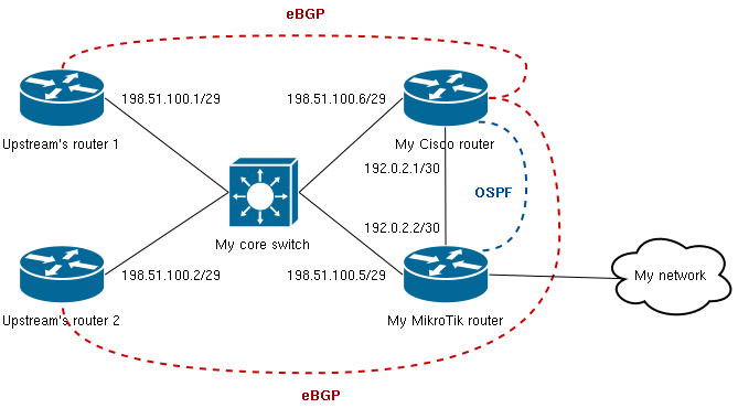 É o seguinte: nesse provedor há dois roteadores no core. Um deles é um Cisco meio antigo, que faz o eBGP com os upstreams (operadoras e IX-SP) e downstreams (clientes de trânsito), e uma CCR, que faz papel de firewall, distribuição de IPs por DHCP para os clientes, etc. Entre esses dois roteadores há OSPF rodando.