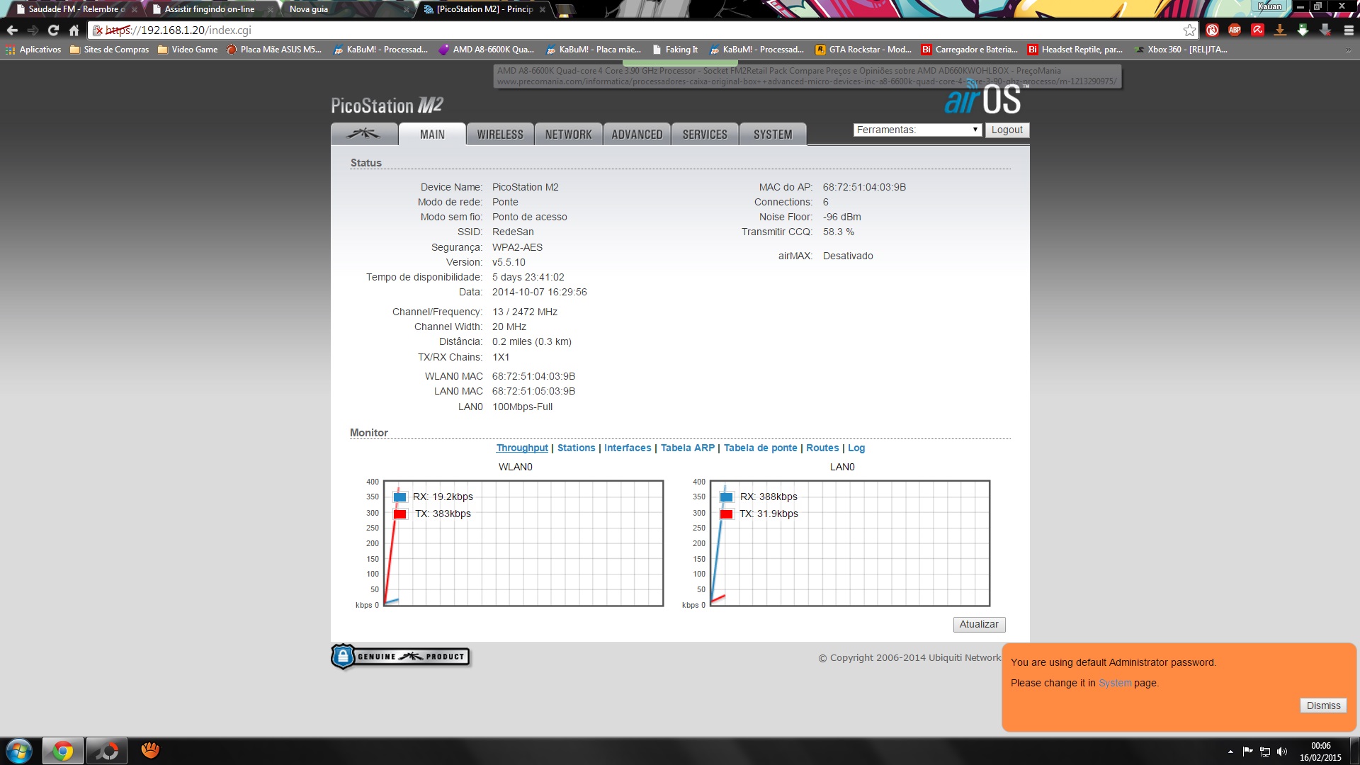 - O Picostation está transmitindo com 23dBm de potencia, e eles tem uma anteninha de 5 ou 6dBi. Isso dá uma potencia EIRP (Soma potencia de radio + ganho de antena) de 28 ou 29dBm.