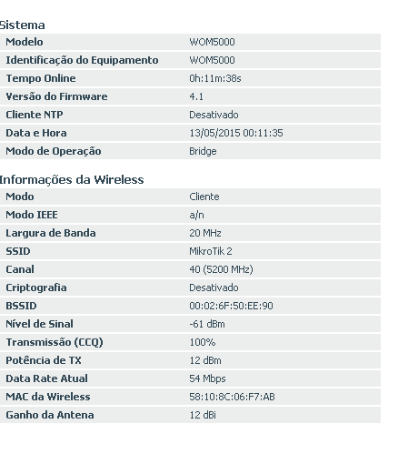 olha me informa com esta configurada sua wom. pois testei como cliente ap, ap, e por fim repetidor universal. acho que esta ae o maior erro e que nao sei isso dae embora ja li muito mas quando consegui deu este erro