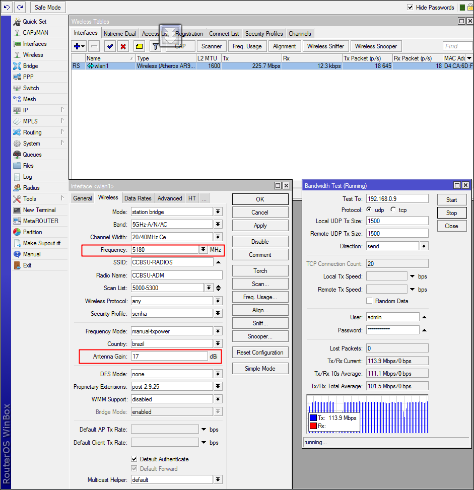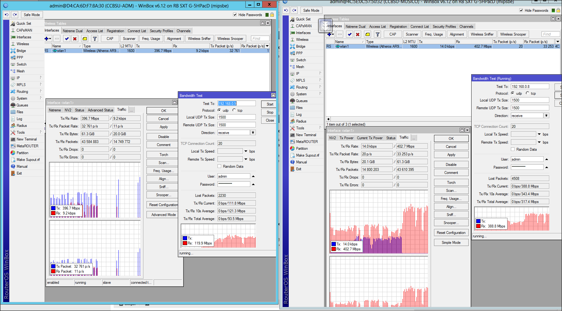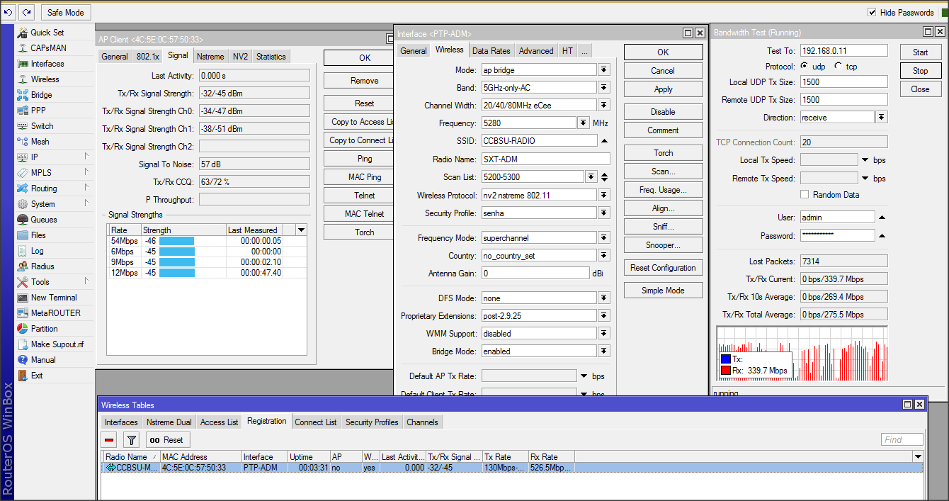 Percebo que no Bandwidth test mostra uma oscilando entre 400Mbps á 85Mbps isso é normal os radios estão entre 30 a 40 metros com visada total