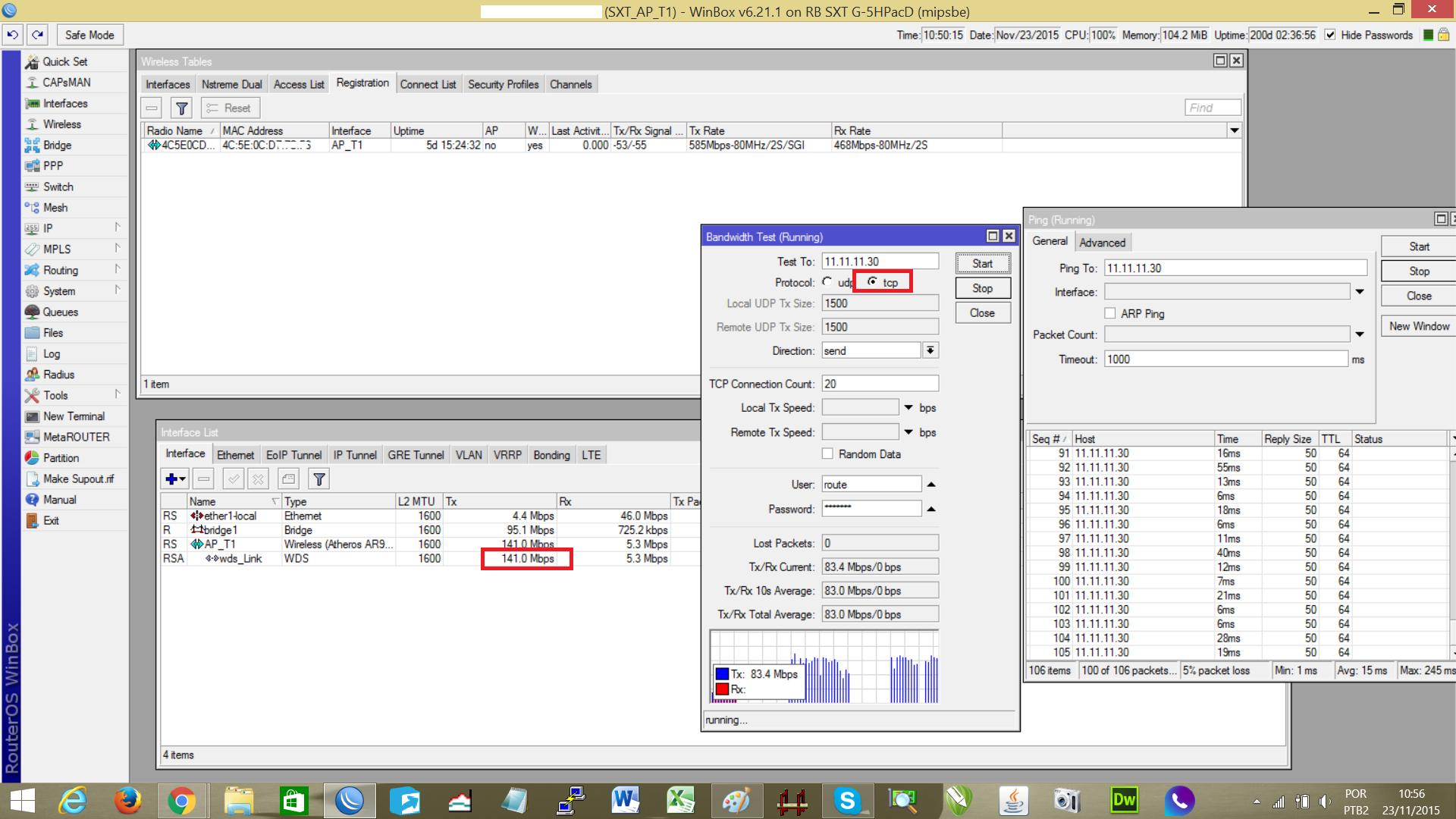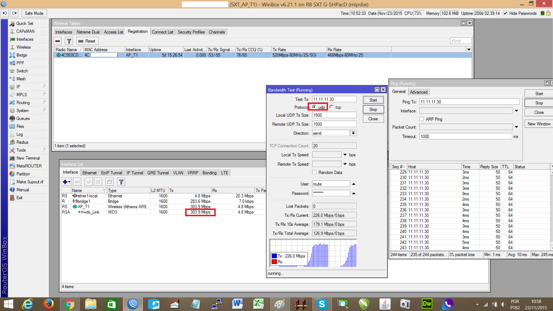 Ontem a noite fiz algumas alterações e no teste de velocidade estava chegando em média entre os radios a 220Mbps mas alternando.