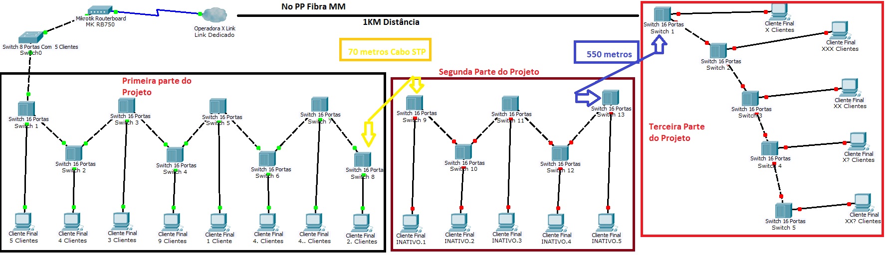 Se Reparar na imagem podem perceber que ele esta levando 9 Switches ( 1 de 8 portas e 8 de 16 portas ), mas tem uma parte da comunidade que ainda esta sem funcionamento seria a segunda parte do projeto, e ainda tenho que levar o link para Comunidade B que seria a terceira parte do projeto