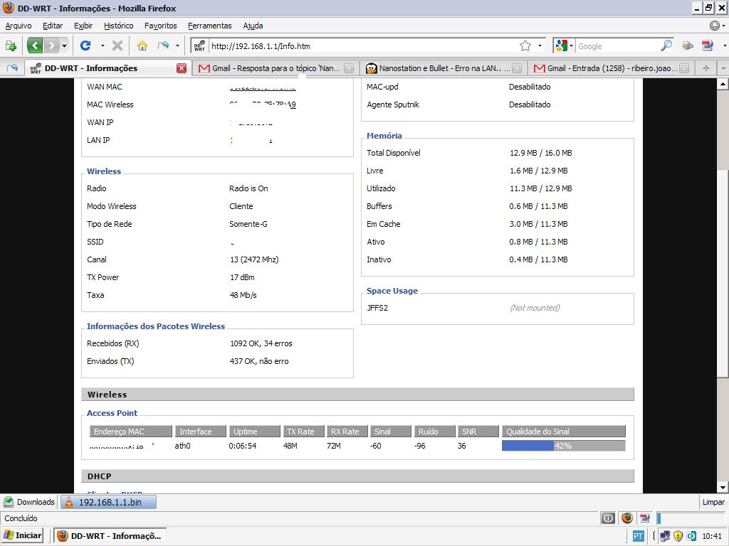 E tráfego está bem alto também, ( 48 e 72). Não sei se isso é real ou uma medição enganosa. Está configurado para Super G. Tem momentos que ele acusa até 108mbps. Logicamente não tem link para isso, mas pelo que pude observar, serve mais como uma medida da qualidade da transmissão e recepção.