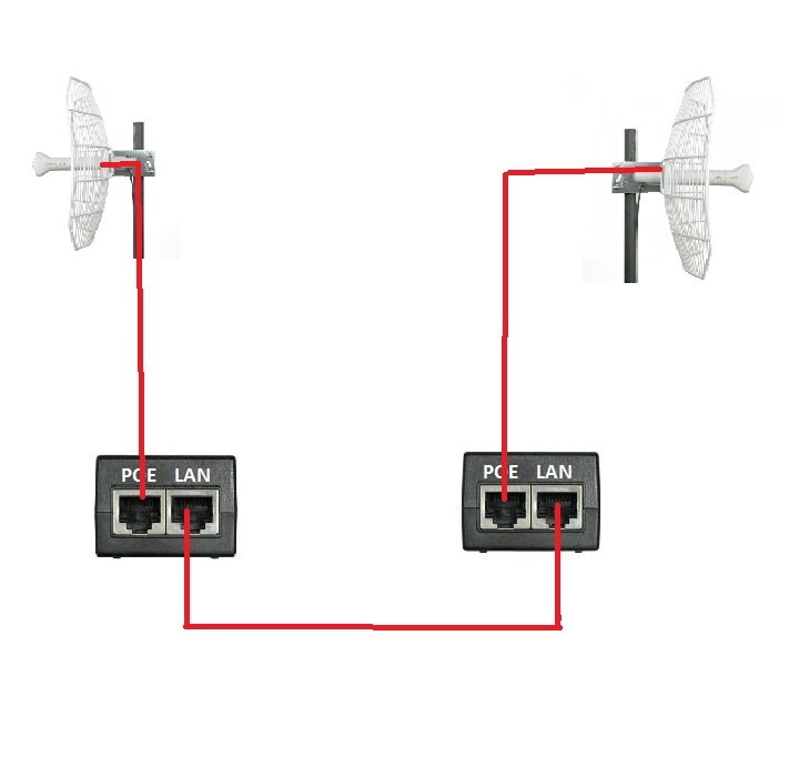 Vou fazer de conta que são duas Airgrid da Ubiquiti... pra simplificar, se tudo estiver em Bridge a ligação é essa: