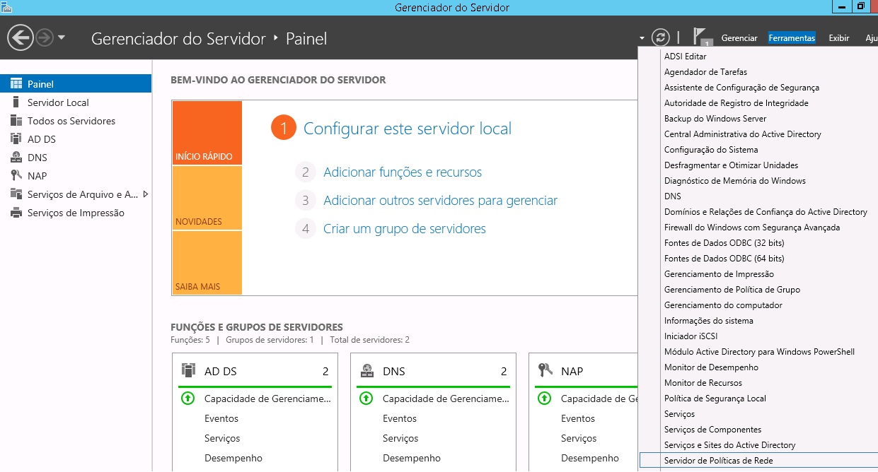 1 - No "Gerenciador do Servidor", clique em "Ferramentas" e depois em "Serviço de Politica de Rede";