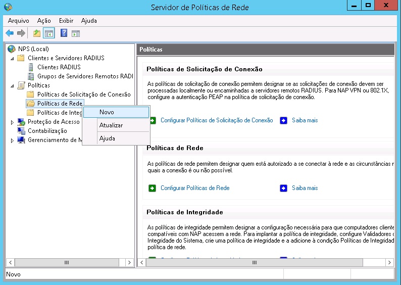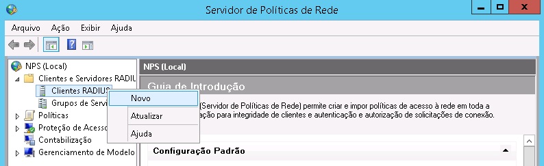 2 - Em "Serviço de Politica de Rede", expanda "Clientes e Servidores Radius" e clique com o botão direito em "Clientes Radius", selecione "NOVO".
