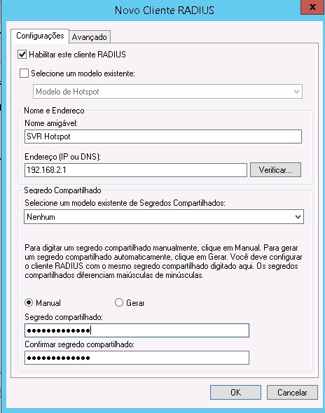 3 - Em "Novo Cliente Radius", em "Nome amigavel" coloque um nome para identifica-lo, em "Endereço (IP ou DNS)" coloque o IP do seu servidor Hotspot, em "Segredo Compartilhado" coloque uma senha para comunicação entre os servidores (Salve essa senha, iremos usa-la mais a frente). Clique em OK.