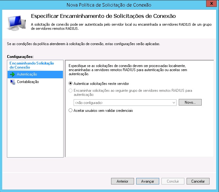 7 - Na janela seguinte ("Especificar Encaminhamento de Solicitações de Conexões"), veja se "Autenticar solicitações nesse servidor" está marcada, e Clique em avançar.