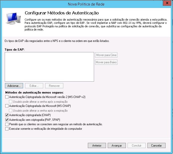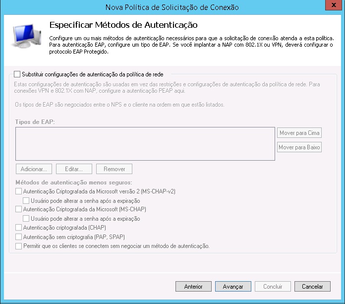 8 - Na janela seguinte ("Especificar Métodos de Autenticação"), apenas clique em avançar.