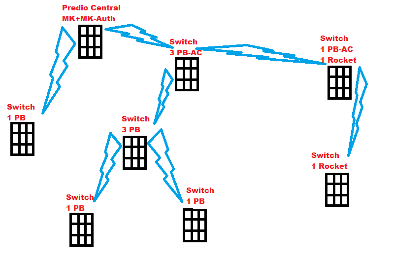 O cenário é assim: Um servidor MK com PPPoE e MK-Auth gerenciando os clientes. São na faixa de 8 prédios, chega o sinal por PB-AC e é distribuído para o prédio por Switch e ao mesmo tempo a outra antena ligada ao Switch manda para outro prédio e assim vai.