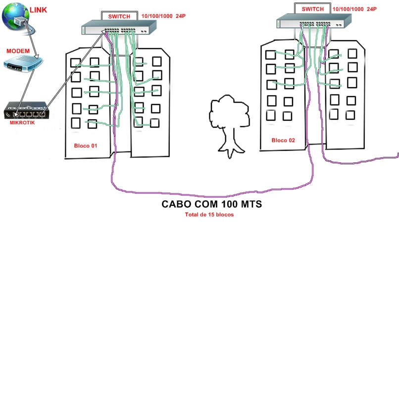 eu pensei em fazer o seguinte . 1 antena rockt M5 no meu bloco para enviar o sinal ,1 mikrotik rb951, nos outros torres , colocaria nanoloco 5.8 para receber o sinal da rockt M5 . Colocaria em cada torre, 1 switch 10/100/1000 de 24 portas para descer internet por cabo para cada apartamento, ,,,,,, todo material em 5,8 por favor me ajudem e que Deus abençoe á quem pode e á quem não pode ajudar tb ,,,, segue as fotos e topologia