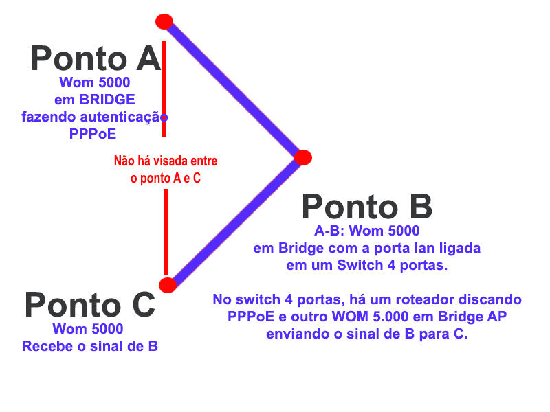 O problema é que preciso adicionar um PONTO C, que só tem visada do ponto B e não do ponto A. No caso, pensei em colocar mais dois Wom 5000 Saindo de B e chegando em C, mas teria que formar uma "bridge" até o ponto A. (Levar de C a A).