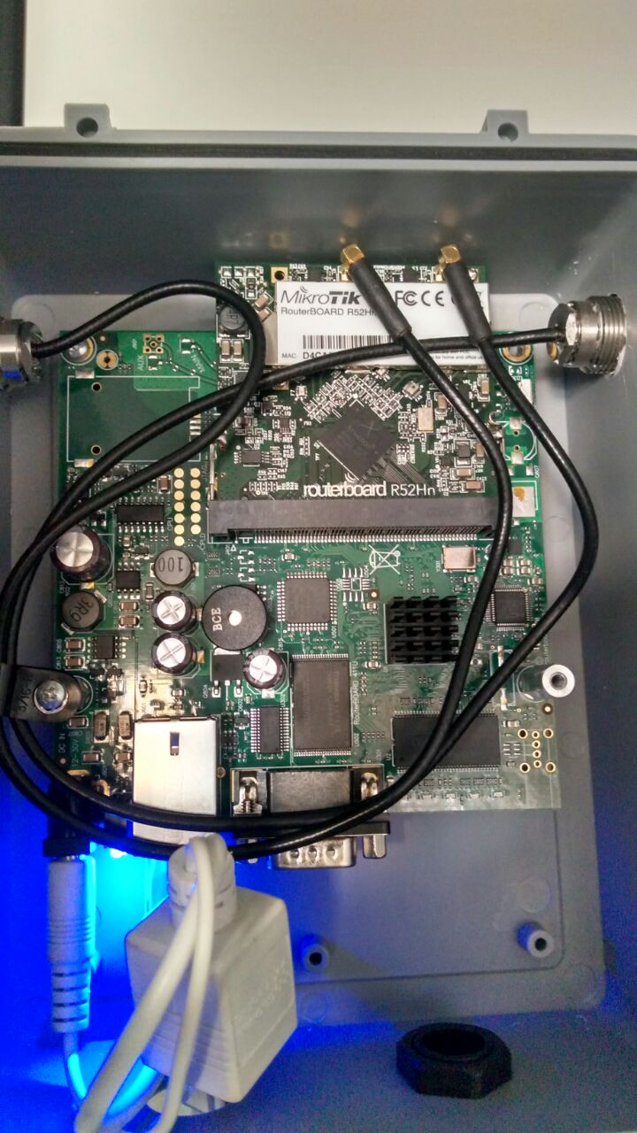 A RB está instalada utilizando um cabo de rede ~2 metros e POE com fonte 12v e 1,5Amp.