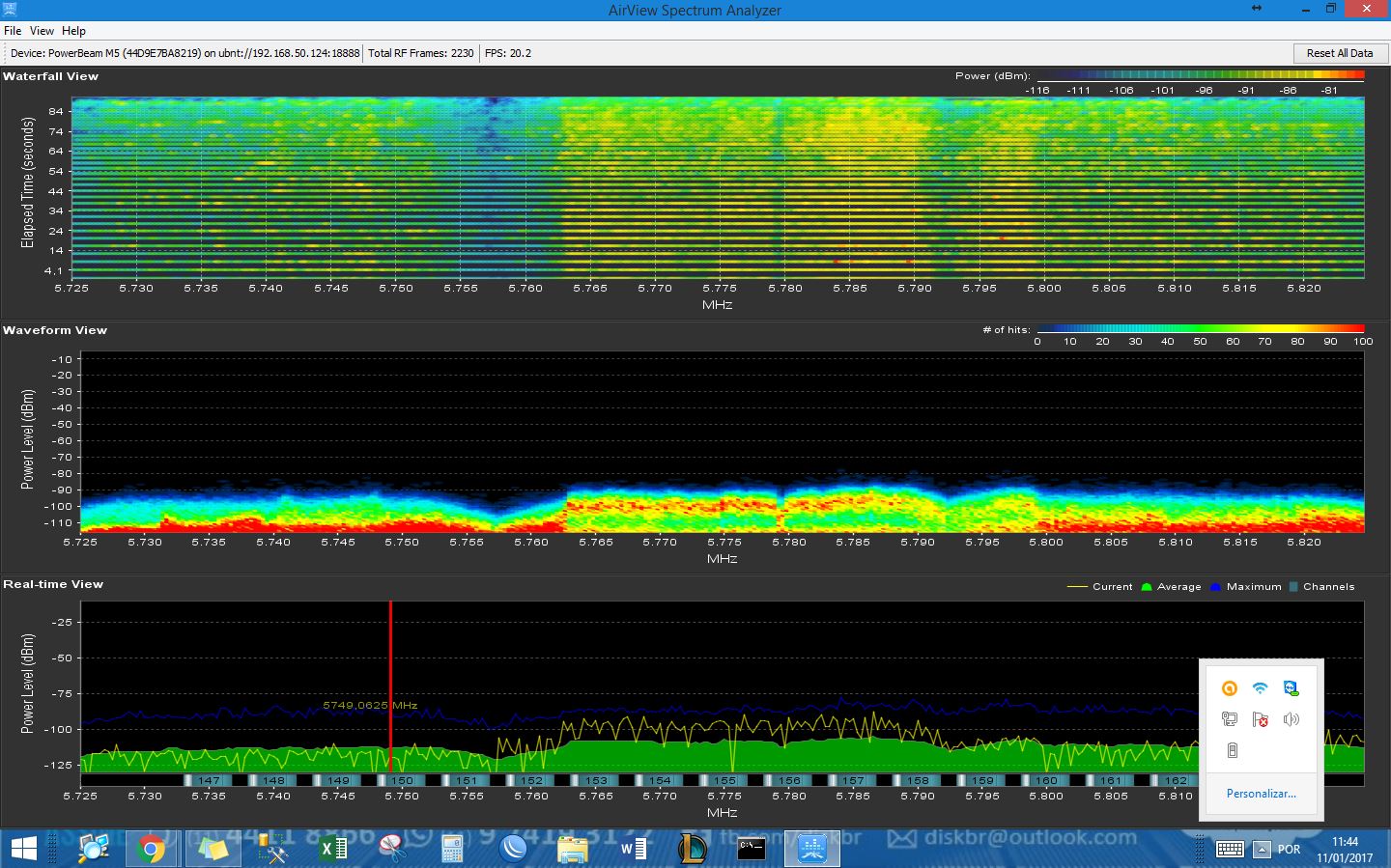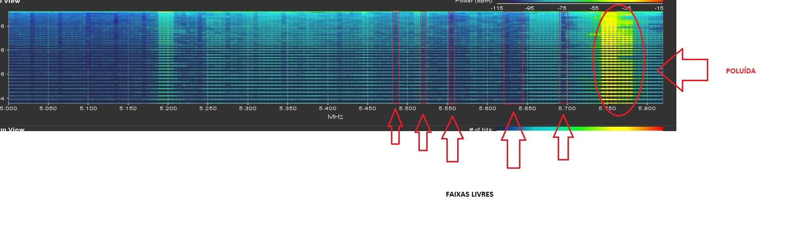 Analisando rapidamente esse pequeno trecho de testes feitos aí, dá pra perceber que tá poluído. O noise floor da faixa inteira está alto aí maior que -95dBm... O que tá mais livre é entre os canais 151 e 152 (5755mhz~5760mhz)
