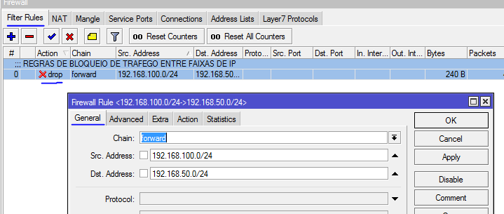 Depois você adiciona na guia Filter, os mesmo itens que estava adicionando, porém, na guia "General", você deixa tanto o "Src. Address" quanto o "Dst. Address" em branco, e na guia "Advanced", no "Src. Address List" você coloca "rede50", e no "Dst. Address List" você coloca "rede100", e na guia "Action", o "Action" é "drop". Depois você tem que adicionar outra regra parecida, porém, inverter o "Src. Address List" e o "Dst. Address List". No terminal, seria assim para adicionar essas 2 regras: