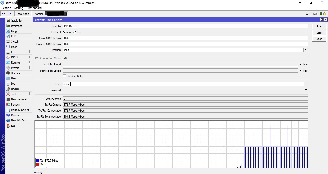 Estou com um probleminha eu tenho duas rb 750g Rex,estou fazendo teste de bancada e quando realizo o teste em UDP a banda chega da 900 MB, sim entendemos que em UDP e um protocolo livre, a onde elimina todas verificações de erro e chegada etc, Diferente do Protocolo TCP que faz todas essas verificações, alem de ser mais confiável, mas por ser duas rbs com portas gigas o teste em TCP so chega a 300Mb seu processamento fica em 50% e não passa disso, não sei se algum Bug ou os requisito da Rb não aguenta.