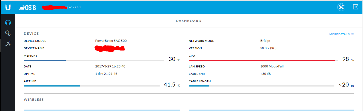 Troquei hoje um lado por Rocket AC, disperdicio de antena o sinal ficou -56 com -4dB de potência. No AirMagic usando o canal indicado. O processamento por volta de 60 a 80% durante o dia. Quero ver durante a noite.