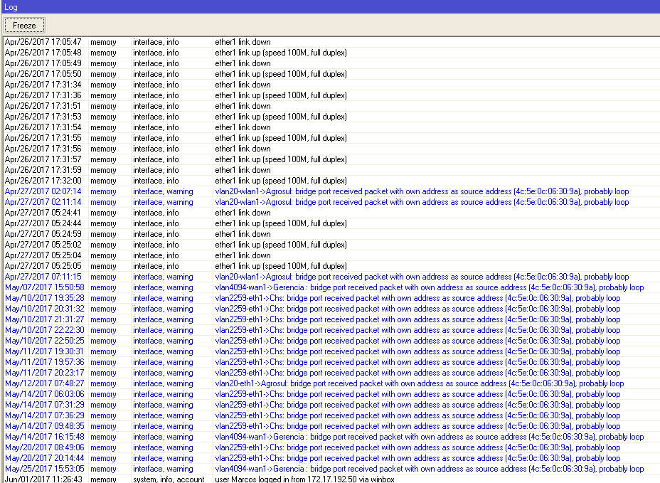 bridge port received packet with own address as source address probably loop alguem ja passou por isso e consegiu resolver ?