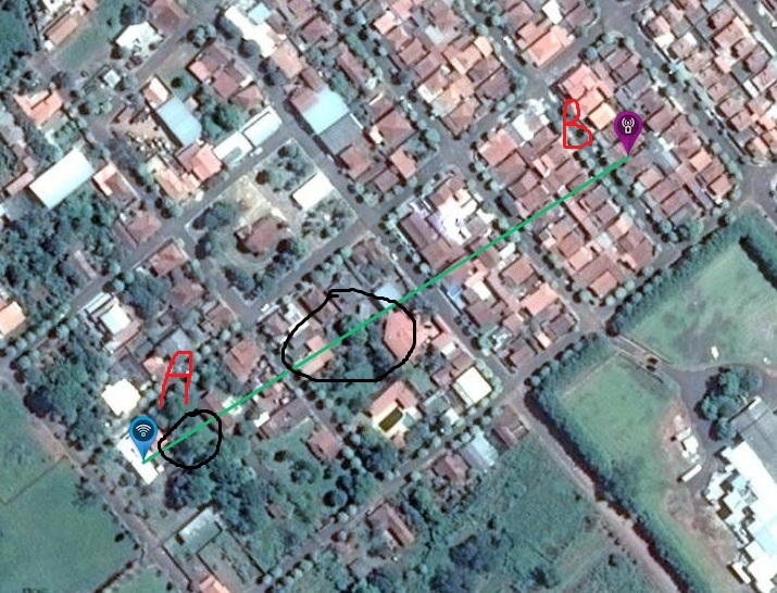 Bom dia, gostaria de uma ajudinha de voces. Preciso fazer um ponto a ponto que passe uns 10mb no minimo, em uma distancia de 300m, porem nao tenho visada 100%, ao subir no telhado do ponto a, eu consigo ver somente os dois vizinhos do ponto b(lado esquerdo e direito), nao consigo ver a casa onde ficaria o ponto b porque na metade do enlace tem umas arvores pequenas (pé de manga). segue a imagem abaixo.