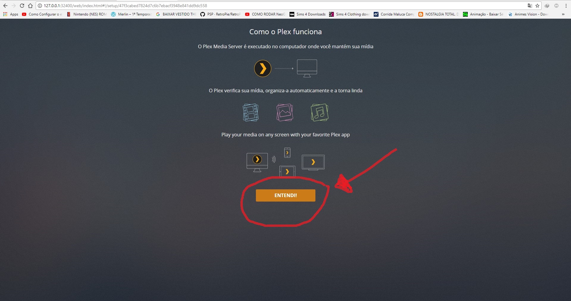 4-apos ter feito tudo isso vamos começa prepara o plex para uso. de 2 clique na lado direto da tela ni icone plex para q ele abra o navegado coloque seu login e senha q vc crio conforma a imagens abaixo.
