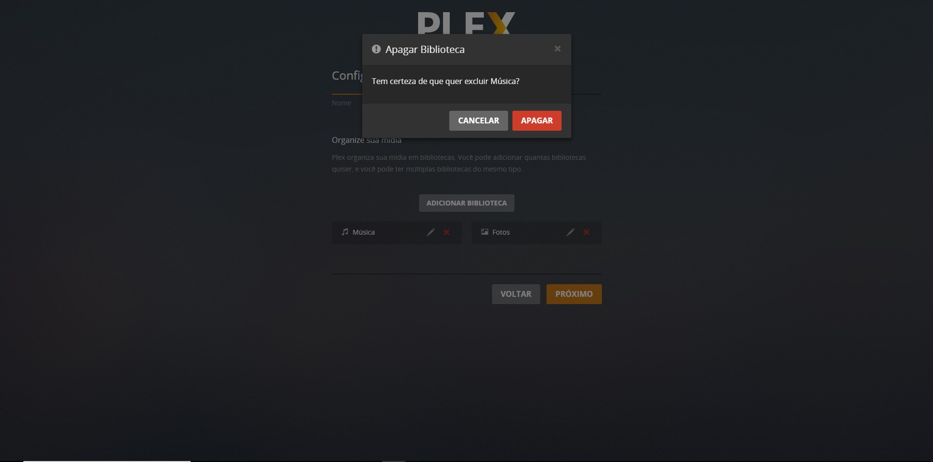 6- No seguinte delete as duos dois genero Musicas e Fotos apete X para fecha e clique próximo conforme a imagens.
