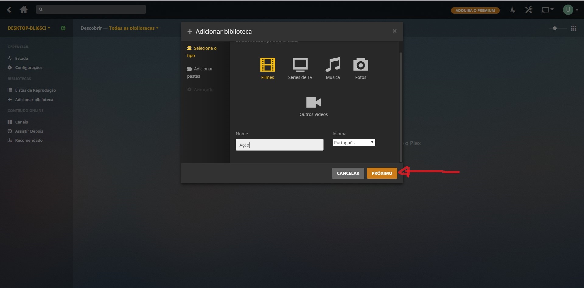 clique em adicionar Biblioteca escolha si for colocar filmes escolha filmes e de um gênero e muda a linguagem para português