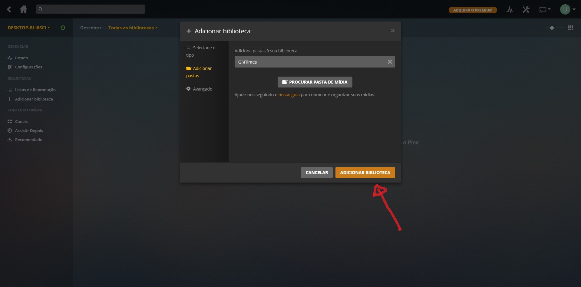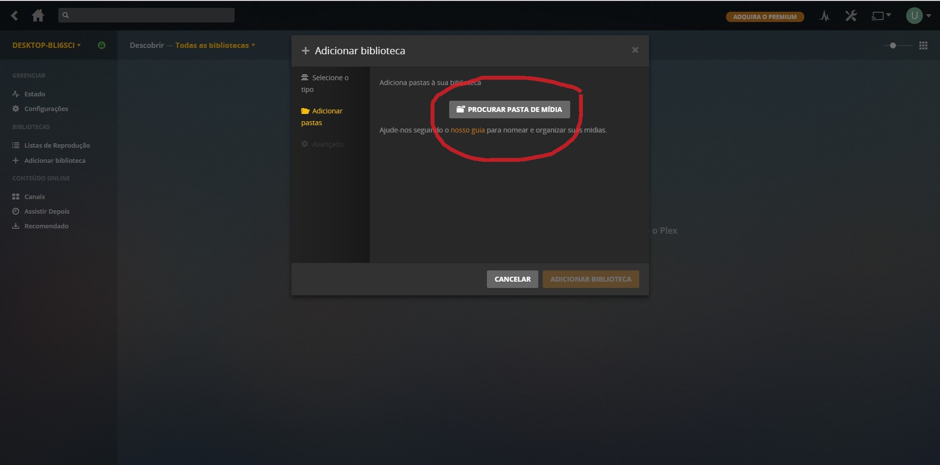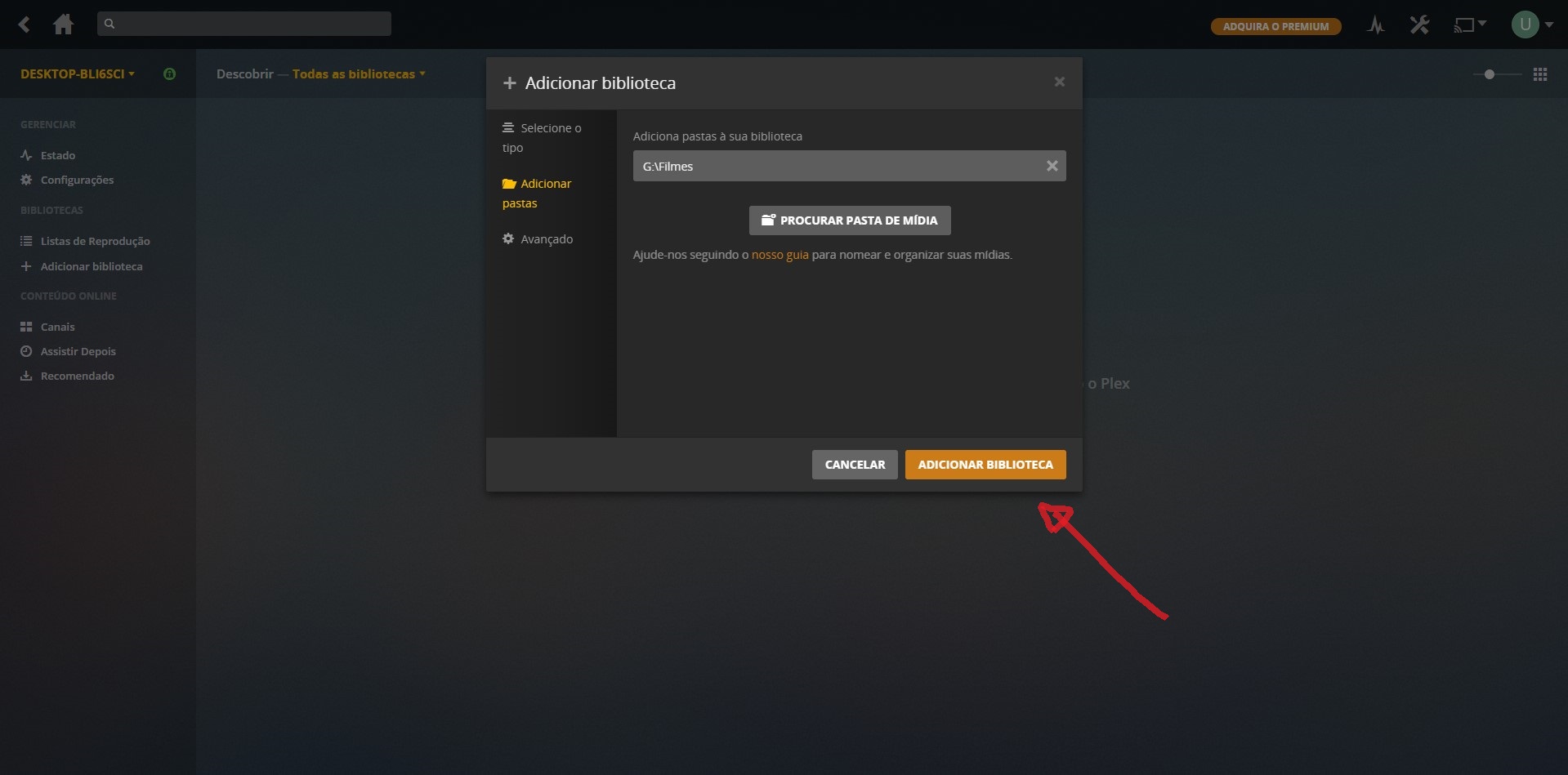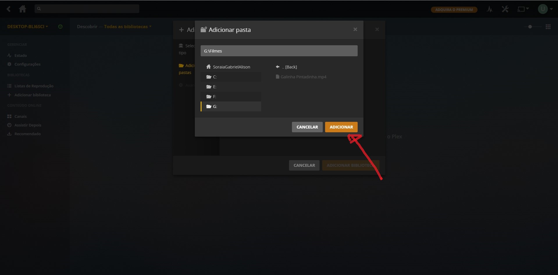 9-Agora vamos localizar onde esta os filmes selecione o local onde esta seus filmes e de um clique na pasta e e depois clique adicionar conforme a imagem abaixo.