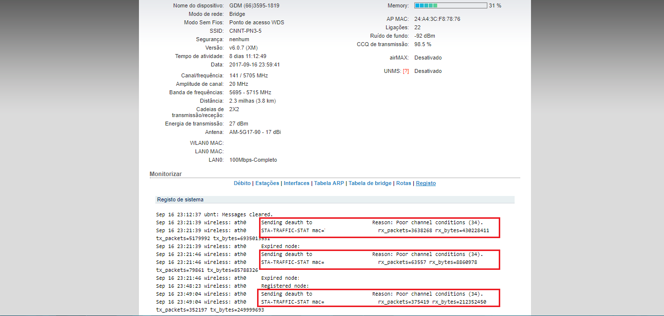 Sei que pode nao ajudar no teu problema, mais porque vc esta usando 27db de potencia no teu radio? E porque desativar o Airmax? em PTMP é muito importante usar TDMA.