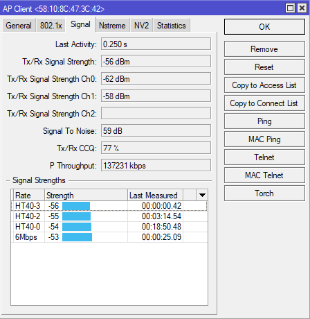 Quem tem 1 chain com sinal ruim geralmente é quem faz cagada nas instalações, colocando antena só 50cm acima dos telhados (A zona de Fresnel já é comprometida na própria casa! Que dirá a perturbação que terá nos obstáculo no meio do caminho!). Diferença de 1dBm dá pra ignorar, variando entre 1 e 2dBm não é o fim do mundo, mas tem essa diferença TEM QUE nivelar pelo menor sinal! Na imagem 1.png é -60dBm (MCS11 com segurança), em 2.png é -58dBm (MCS12 com segurança) e 3.png é -62dbm (MCS11 com segurança), não importa se algum chain tem sinal maior, o que importa é nivelar pelo PIOR, mas não pode ter algo tão ruim quanto o cl.png, esse sinal de -70dBm e outro 19dBm maior, em -51dBm, força o uso de só 1 chain, e vai PARECER tudo bem só quando esse cliente não tem tráfego, hora que ele tiver alto tráfego (Depende do pacote vendido pra ele também) o CCQ vai cair pra mixaria, é 100% só enquanto tem só pacotes de sincronia trafegando (E pacotes de sincronia usam uma modulação de sensibilidade muito boa, por isso esses pacotes raramente são perdidos mesmo com sinais tipo -80dBm).