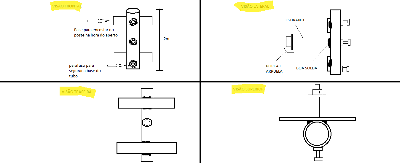 Olá pessoal! Preciso fazer um enlace PTP com o uso de dois postes. Os postes possuem 10m de altura e preciso crescer mais 7m em cada um. Tenho em mente fazer isso com tubos de metal, emendar um tubo de 6m com um tubo de 3m, dando num total de 9m deixando 2m para o suporte, mas preciso de ideias de suportes que aguentem o peso do anexo que irei colocar no poste, que ficará em torno de uns 60kg mais ou menos, projetei um mas nao sei se ficaria firme o suficiente para encarar as leis da fisica que envolve tal estrutura. com o suporte estaiarei o tubo. então segue a imagem do projeto que tenho em mente mas nao sei se vai dar certo. O que acham?Clique na imagem para uma versão maior