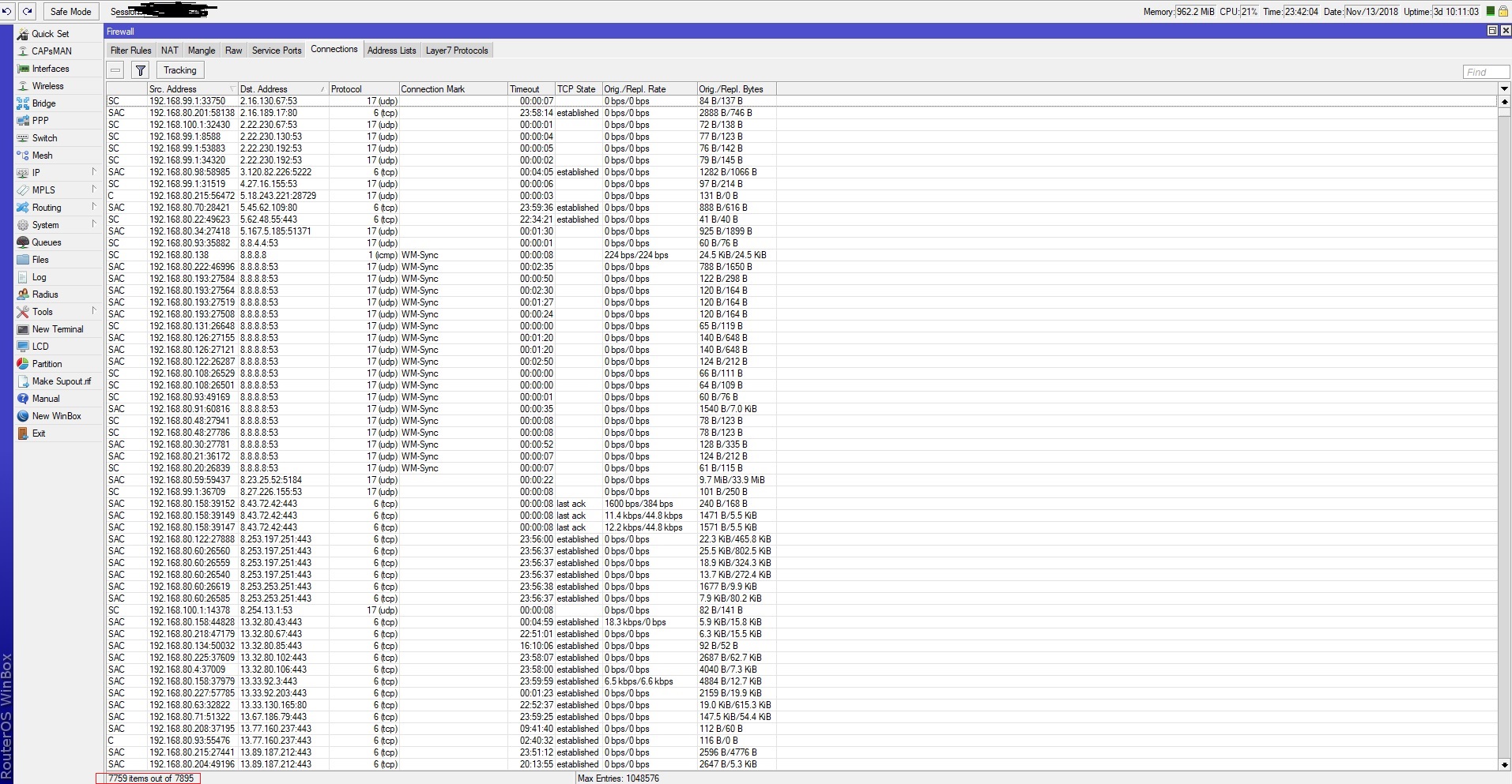 Pessoal estou com uma duvida relativa a tabela Firewall/Connections no mikrotik, na minha borda sempre tem menos conexões que no core PPPoE, exemplo na borda tem cerca de 4600 conexões e no core PPPoE tem cerca de 7800 conexões, isso é normal ?